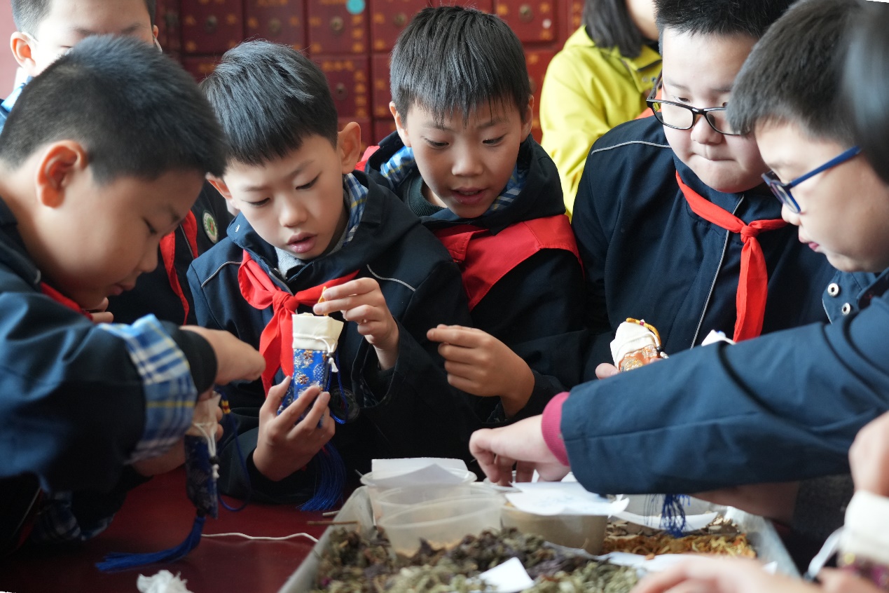 在中药香包制作实践区,活动进入了动手体验环节。在专业老师的指导下,同学们学习了不同中药的养生功效、香包配方搭配原则与制作技巧。大家兴致盎然地亲手挑选药材、配制填料、动手缝制,在实践中深化了对中医药实用性的理解。亲手制作的香包不仅成为此次研学的独特纪念品,更让同学们直观感受到中药在日常生活中的应用价值,有助于他们将中医药养生理念传递给更多人,进一步扩大中医药文化的传播影响力。